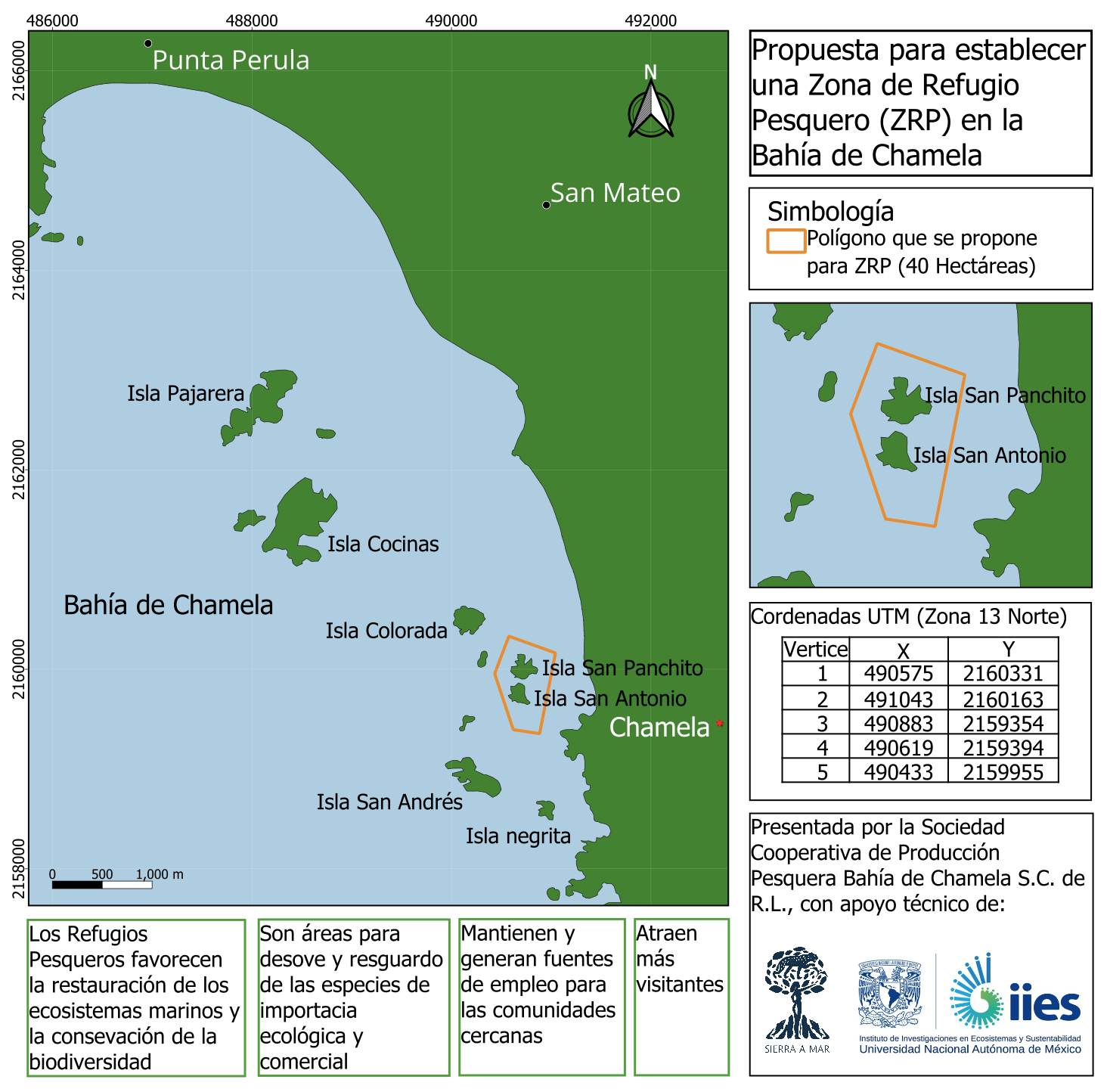 Community agreement to monitor and protect the waters surrounding the islands of San Antonio and San Pancho, within the proposed fishing refuge area. This agreement has the support of all the cooperatives in Chamela Bay and the Regional Federation of Cooperative Societies of the Fishing, Aquaculture, and Tourism Industry of Bahías de Jalisco S.C. de R.L. de C.V.