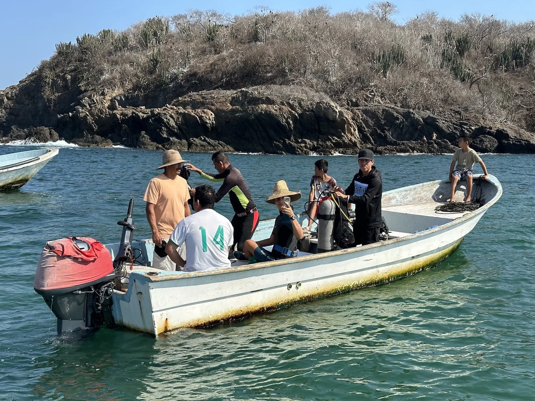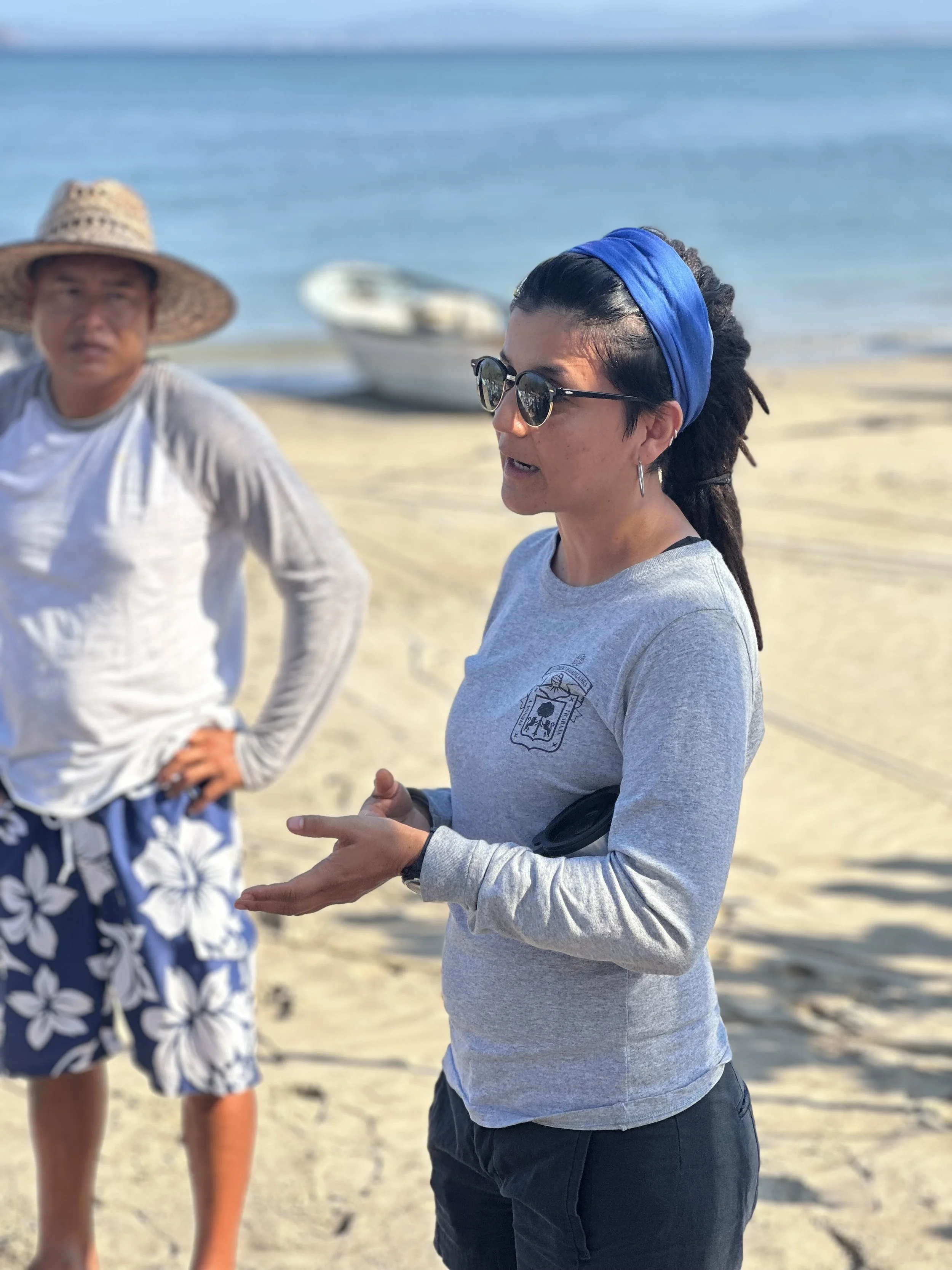 The fisheries cooperative of Chamela, Sierra A Mar team, Unam representatives, and our friends from Alegre Scuba came together to clean up several areas in the fisheries refuge area around the islands of Chamela Bay. After the clean up, Gilles Fortin gave a presentation on scuba safety considerations when diving on compressed air and the fishermen shared their experiences with us when dealing with surface supplied air. Ideas on how and where to install First Aid equipment were exchanged.